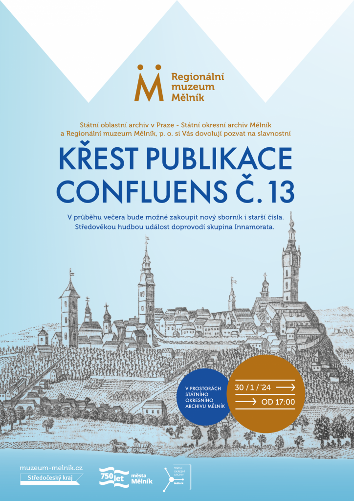 dovolujeme si Vás srdečně pozvat na slavnostní křest Confluens – vlastivědného sborníku Mělnicka č. 13, které opět nabízí možnost nahlédnout do bohaté minulosti města a jeho okolí. Nové číslo vychází u příležitosti oslav 750 let města Mělníka a jeho slavnostní prezentace proběhne v úterý 30. ledna 2024 od 17.00 hodin v prostorách Státního okresního archivu Mělník. Věříme, že v pořadí třináctý Confluens přispěje k rozšíření Vašich poznatků a vědomostí o dějinách Mělníka a mělnického regionu, přinese Vám mnoho dosud neznámých, zajímavých informací z historického dění a každodenního života v našem městě napříč dějinnými etapami od středověku až po současnost. Sváteční akt doprovodí vystoupení středověkého hudebního seskupení Innamorata. Těšíme se na setkání!