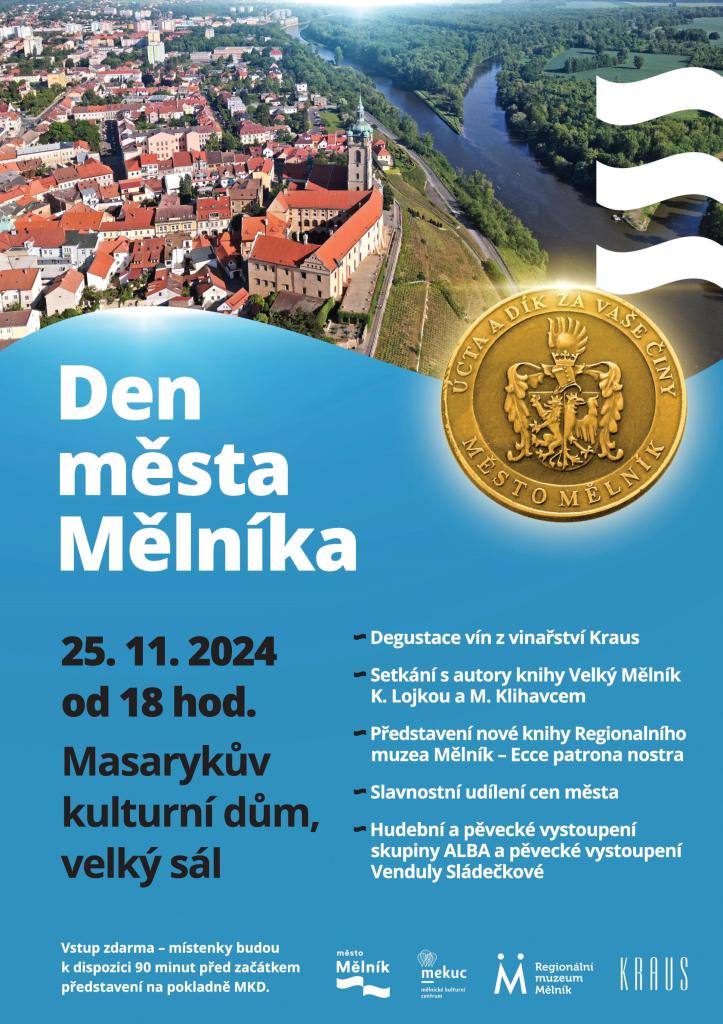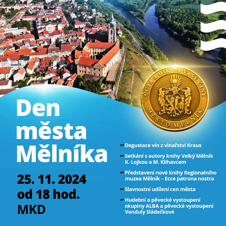 Těšit se můžete také na slavnostní udílení cen města, setkání s autory knihy Velký Mělník Karlem Lojkou a Martinem Klihavcem, degustaci vín z vinařství Kraus, hudební a pěvecké vystoupení skupiny ALBA a pěvecké vystoupení Venduly Sládečkové.
