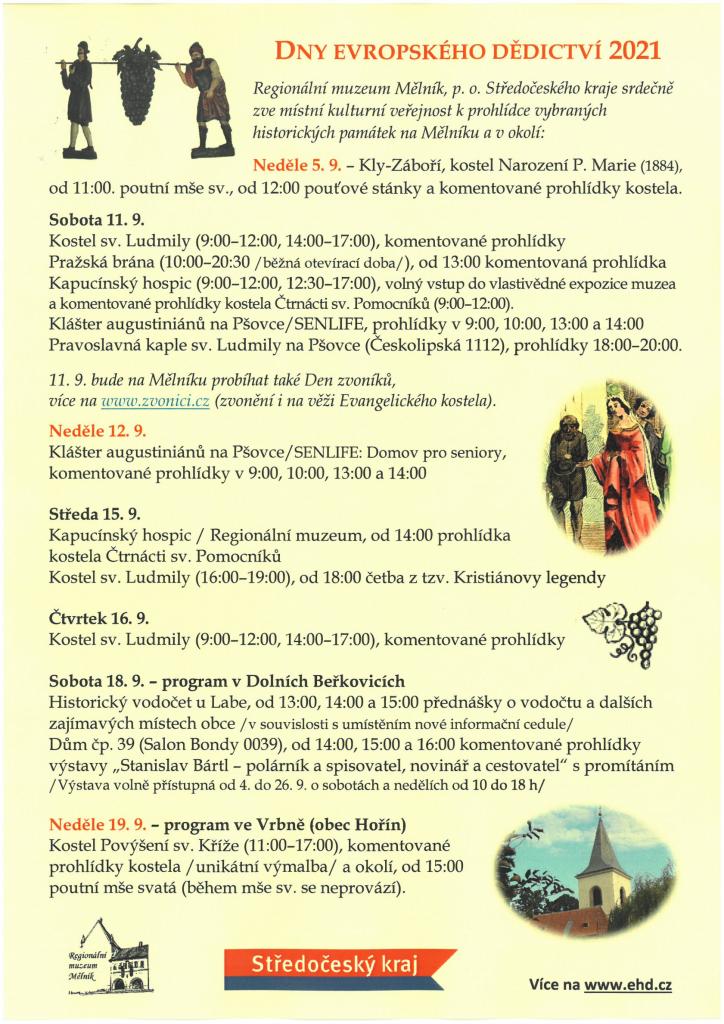 Tradiční akce, kterou pořádá Regionální muzeum Mělník v roli lokálního garanta, se letos, opět ve spolupráci s místními patrioty, zaměří na regionální památky a svatoludmilské jubileum. Bude probíhat o víkendech 11.-12. 9. a 17.-18. 9.