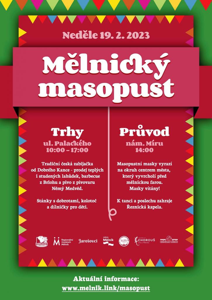 14:00 Začátek masopustního průvodu na náměstí Míru, budeme zpívat a dovádět jak jen to půjde! Zakončení proběhne před mělnickou farou v ulici Česká vystoupením folklorních souborů Jarošáček a Jarošovci. Masky vítány!
