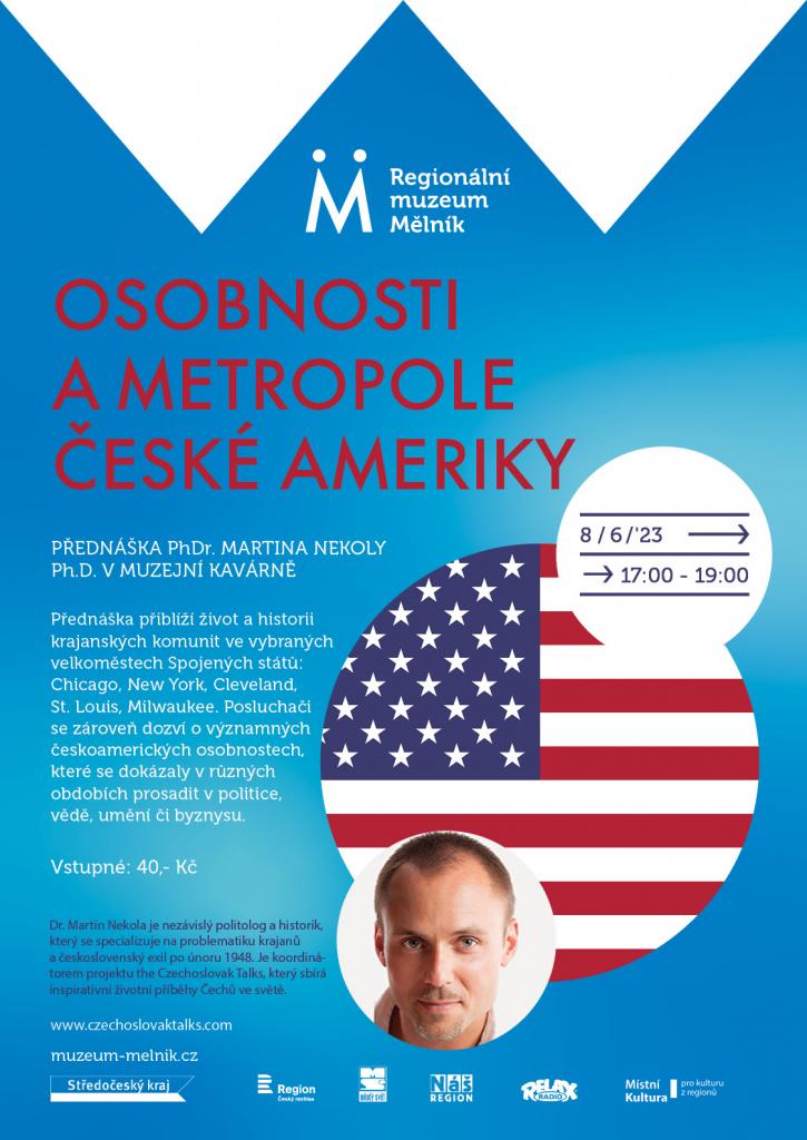 Přednáška přiblíží život a historii krajanských komunit ve vybraných velkoměstech Spojených států: Chicago, New York, Cleveland, St. Louis, Milwaukee. Posluchači se zároveň dozví o významných českoamerických osobnostech, které se dokázaly v různých obdobích prosadit v politice, vědě, umění či byznysu.