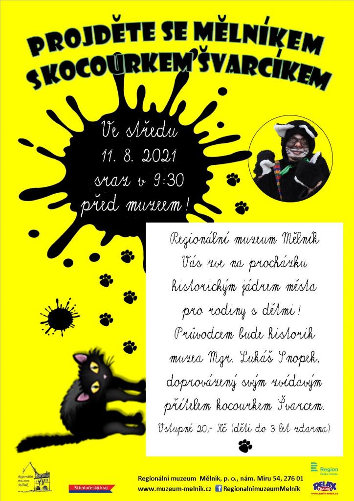 Procházka historickým jádrem Mělníka pro rodiny s dětmi. Průvodcem bude historik muzea Mgr. Lukáš Snopek, doprovázený svým zvídavým přítelem (maskotem muzea) Kocourkem Švarcem…Tato dvojice hravou formou, vtipnými dialogy a několika úkoly přiblíží účastníkům minulost města nad soutokem a jeho zajímavosti.