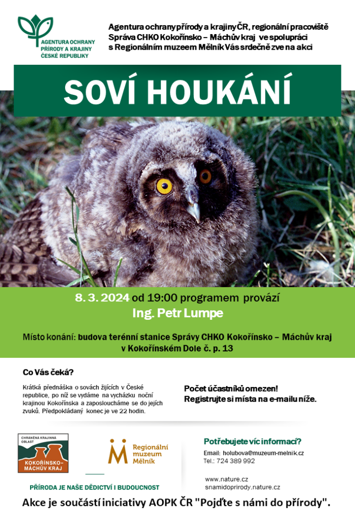 Sejdeme se na terénní stanici Správy CHKO Kokořínsko - Máchův kraj v Kokořínském dole č. p. 13. Po krátké přednášce o sovách žijících v České republice, se vydáme na vycházku noční krajinou Kokořínska a zaposloucháme se do jejích zvuků.