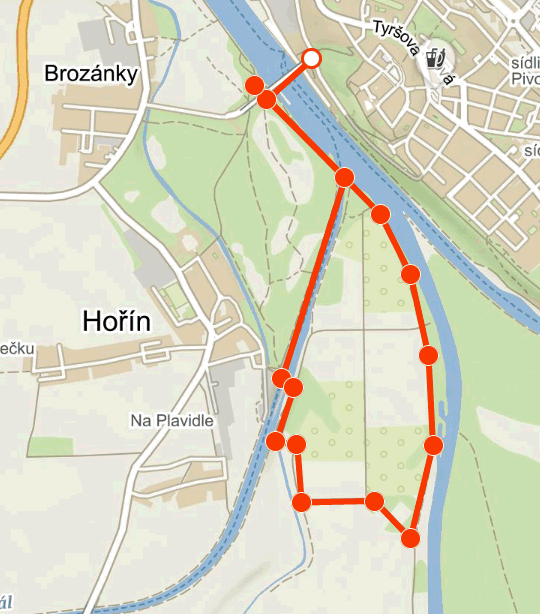 Trasa povede od starého mostu podél Labe a kanálu k hořínskému zdymadlu, pak k Vltavě a zpět k mostu. Délka trasy cca 5 km. Sraz v 9:00 před muzeem (na nám. Míru 54).